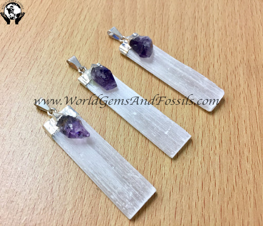 Beautiful, top quality Selenite Blade W/Amethyst Point Pendants. Size: 2"-2.25" long, approximately.