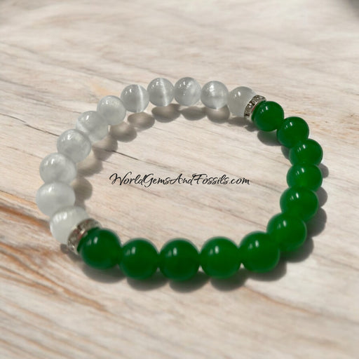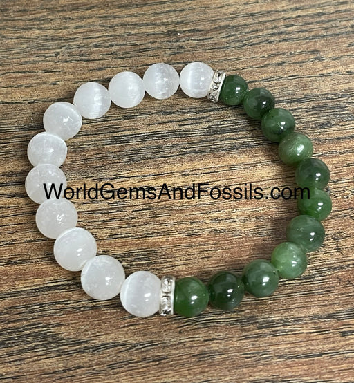 Selenite Nephrite Jade Bracelet 8mm. Quantity Prices $4.99/Pc for 1 – 9 Pcs$4.85/Pc for 10 Pcs$4.65/Pc for 30 Pcs$4.50/Pc for minimum of 50 Pcs