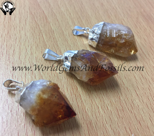 Beautiful, top quality silver plated Citrine pendants. Size: 1" long, approximately. Bulk PURCHASING DISCOUNT: 5 pcs $2,75/ea, 25 pcs $2.50/ea.