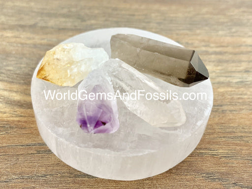 Crystal Point Collection Plate. Points: Clear Quartz, Amethyst, Citrine and Smoky Quartz. Selenite Plate: 2.5", approximately.